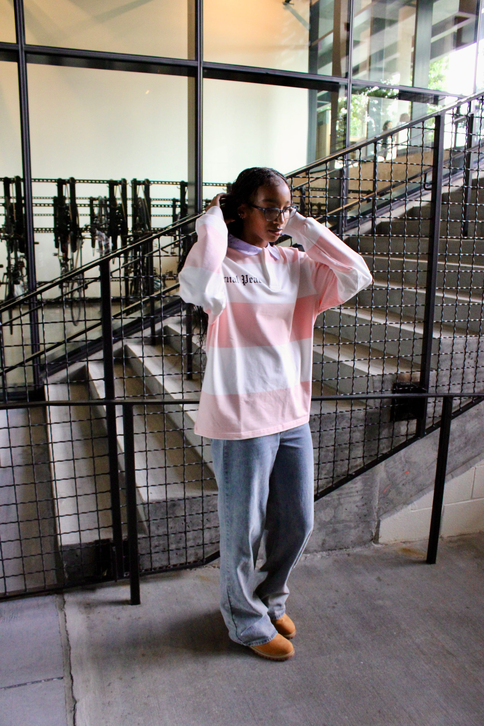 Pink and White Rugby Long Sleeve Shirt with Diamond Collar